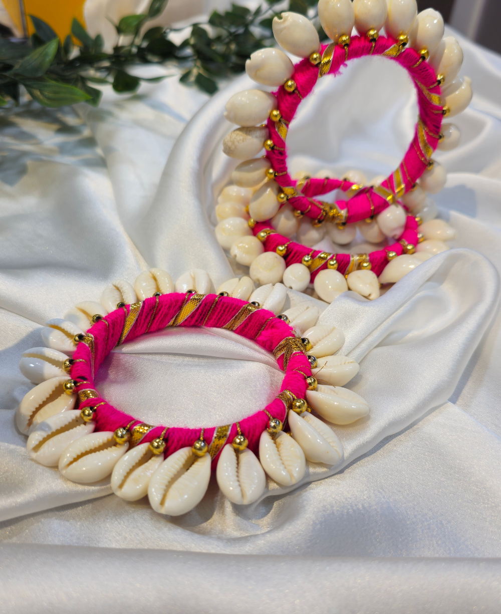 Each piece features real cowrie shells, golden beads, and vibrant pink thread wrapping, making it a perfect embellishment for wall clocks, trays, wall art, nameplates, and other resin decor projects.