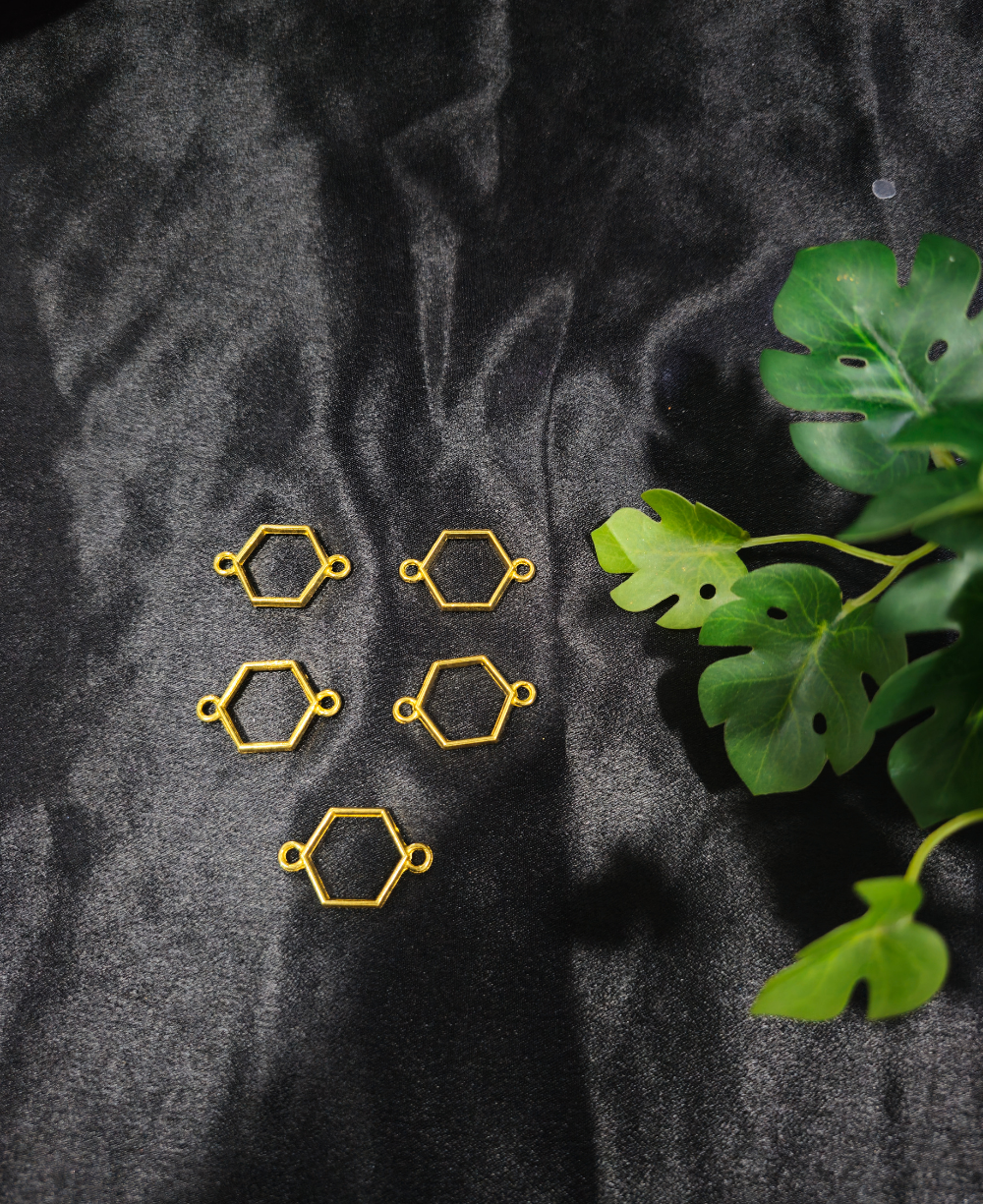 “Gold double-sided round resin bezels arranged on a black fabric background with green leaves