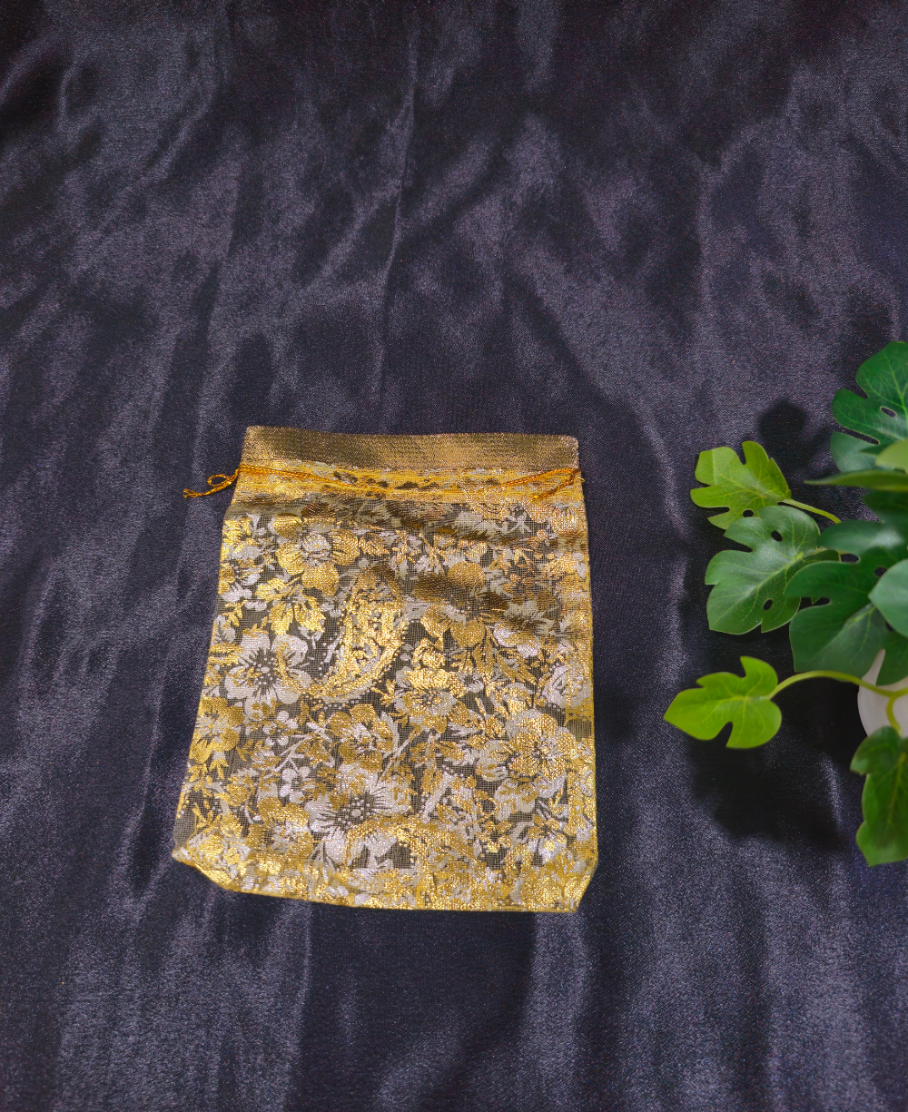 Beautiful golden organza gift bag with floral design and drawstring closure. Perfect for jewellery and gifting.
