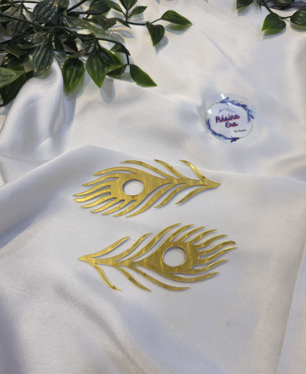 Stylish golden peacock feather acrylic cutout for resin art and decorative crafts.