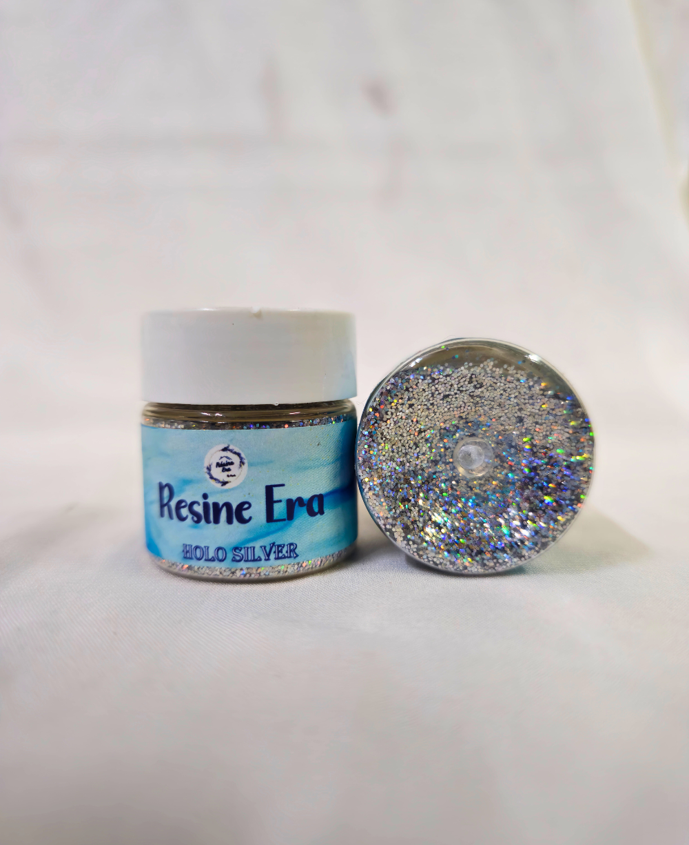 Premium-quality Holo Silver Glitter powder for resin art and crafts. Adds a beautiful holographic shine and blends smoothly into epoxy resin. Ideal for all types of resin artworks.
