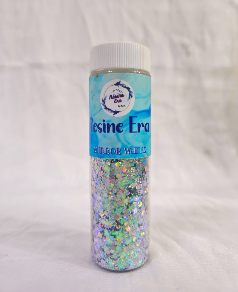 Add a stunning sparkle to your resin creations with Resine Era Mirror White Glitter . Perfect for resin art, jewellery making, coasters, keychains, wall clocks, trays, and other DIY projects. Our premium-quality glitter has ultra-fine reflective particles that deliver a mesmerising shimmer and smooth blending in epoxy resin. Safe, easy to mix, and long-lasting?ideal for professional artists and hobbyists alike.