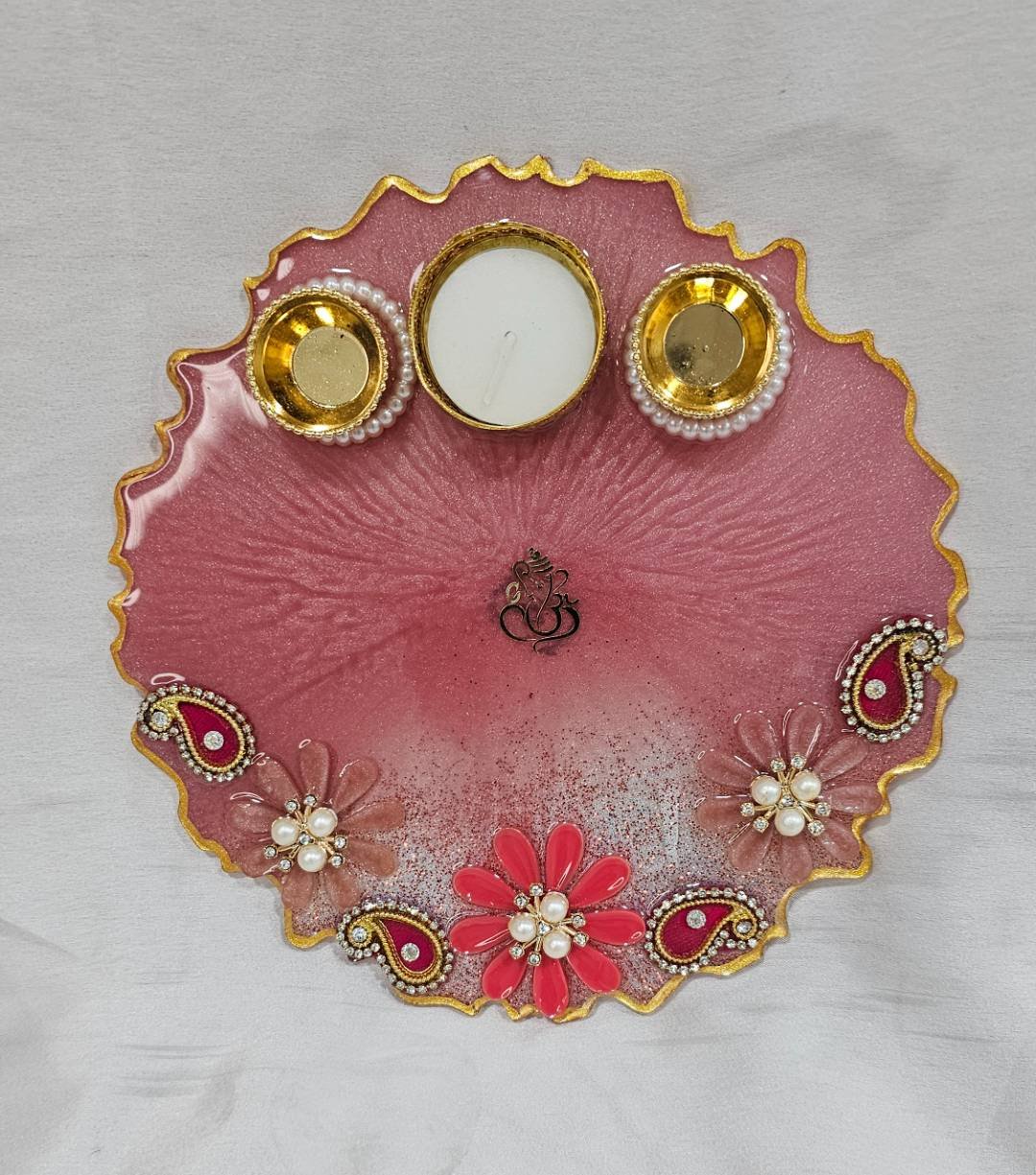 Elegant Handmade Pink Pooja Thali with floral & bead design. –