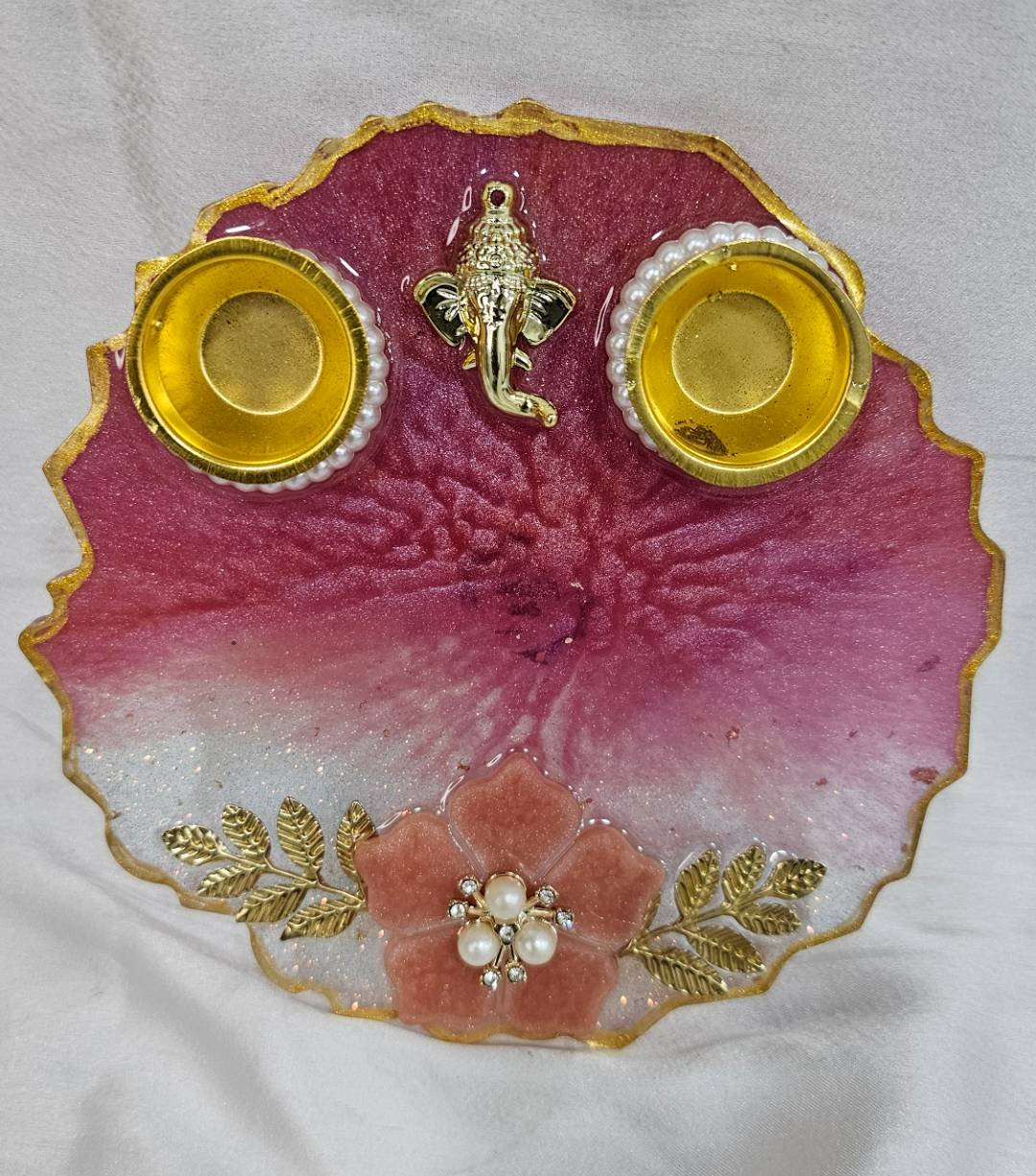 Elevate your festive rituals with this handmade resin pooja thali featuring a golden Ganesha idol, two diya holders decorated with pearls, and a stunning pink floral design. Ideal for Diwali, Karwa Chauth, Raksha Bandhan, Ganesh Chaturthi, and wedding gifting.