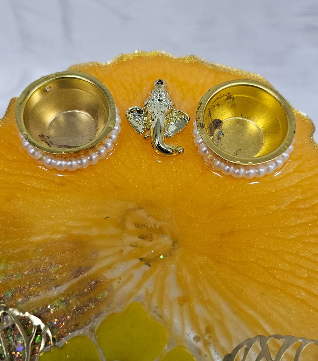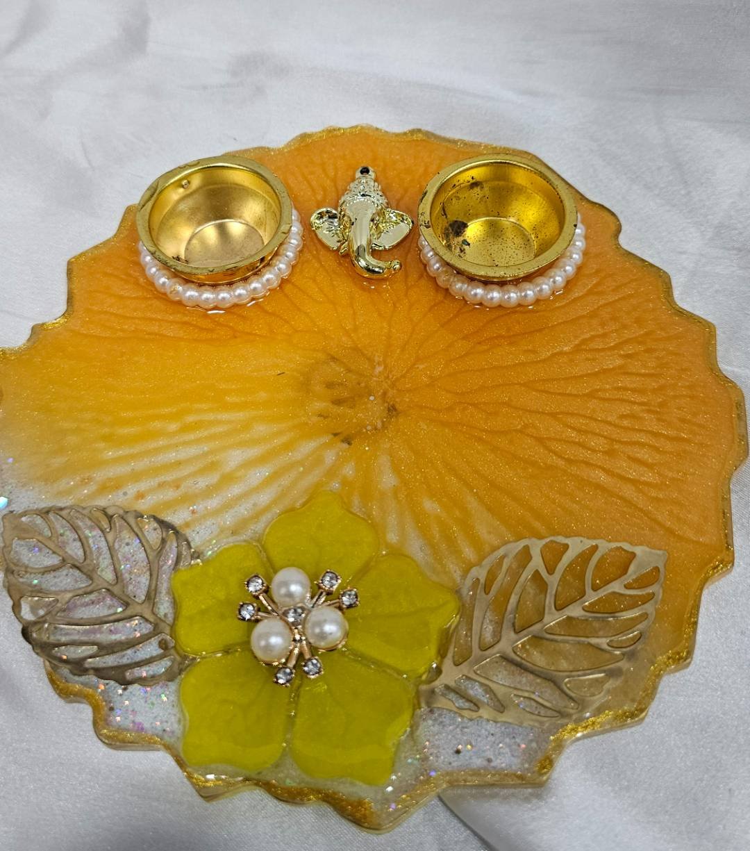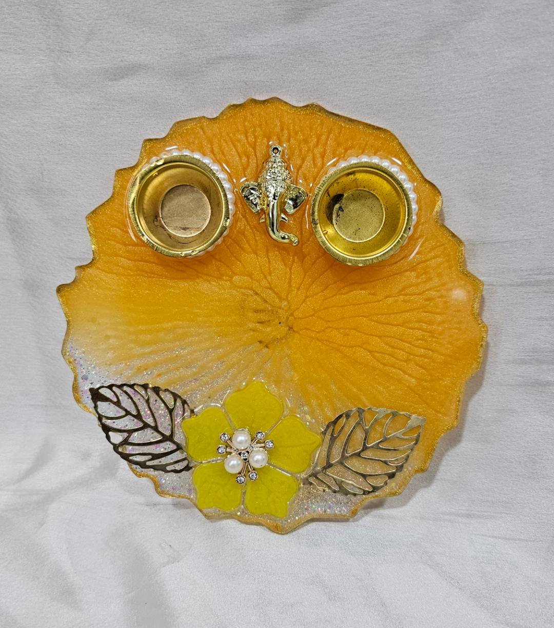 Brighten your rituals with this Handcrafted Yellow Pooja Thali. Adorned with a central flower design, metallic leaves, and a divine Ganesha emblem, this thali is a perfect choice for Diwali, Ganesh Chaturthi, Rakhi, and Wedding rituals. Its cheerful color and intricate detailing make it a must-have for your celebrations.